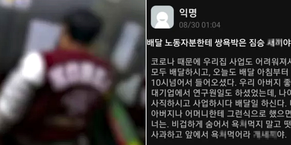 A씨는 "배달 노동자분한테 상욕 박은 짐승 XX야"로 글을 시작하며 "코로나 때문에 우리 집 사업도 어려워져 아버지, 어머니 모두 배달하시고 오늘도 10시 넘어서 들어오셨다"라고 서두를 시작했다.