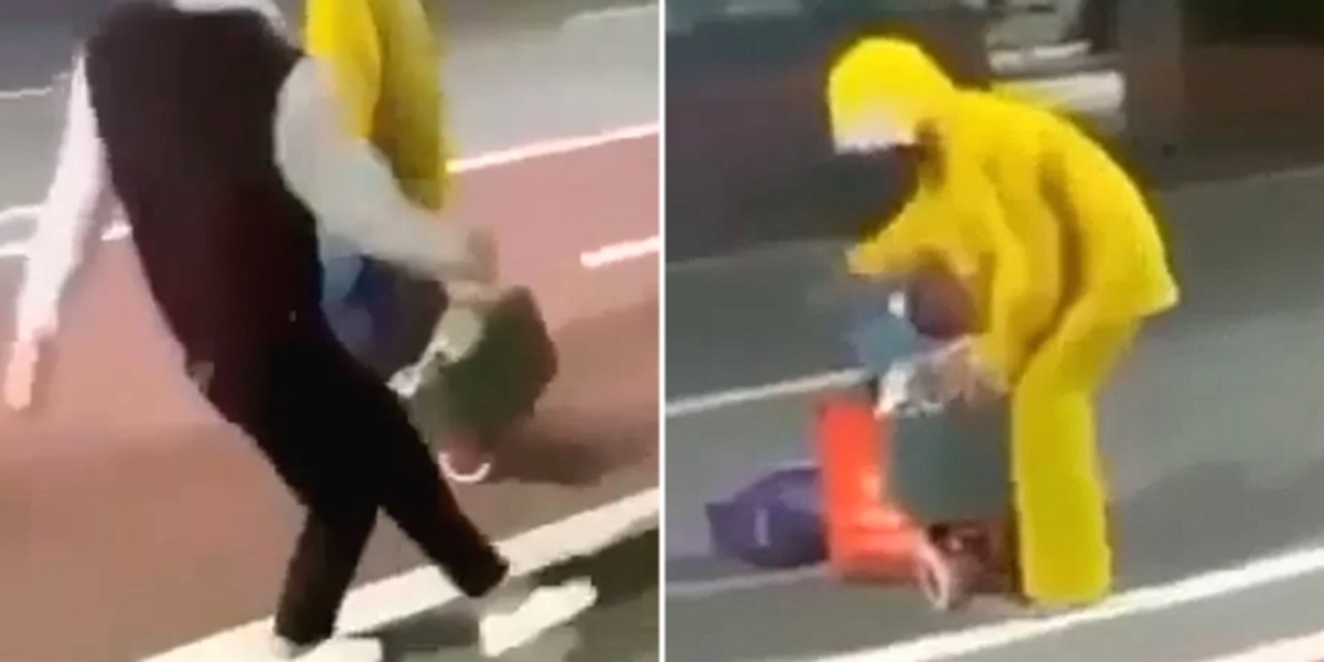 영상 속 우비를 입고 쪼그려 앉아 있던 할머니는 교복을 입은 남학생들이 시비를 걸며 괴롭히자 자리를 피하기 위해 일어섰다.