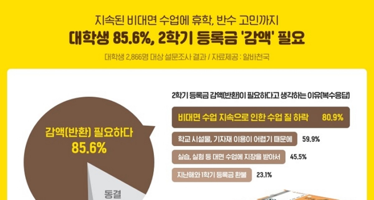 알바천국이 대학생 2,866명을 대상으로 조사 결과 85.6%가 2학기 등록금 감액이 필요하다고 답했다. 감액 정도는 '21~30%(30.8%)'와 '31~50%(25.6%)' 수준을 가장 많이 희망했다.