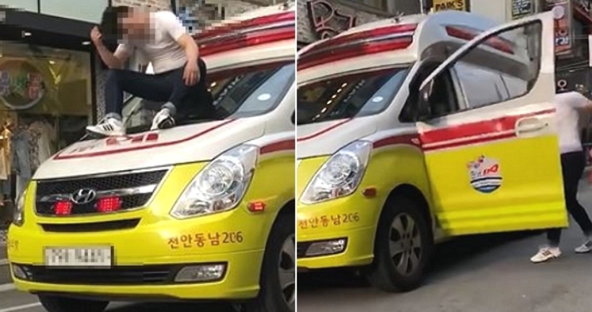 그는 구급차 위에 올라가 "건들지 마"라고 소리를 지르고 구급차 운전석 문을 열었다 닫았다를 반복하며 격앙된 모습을 보였다.