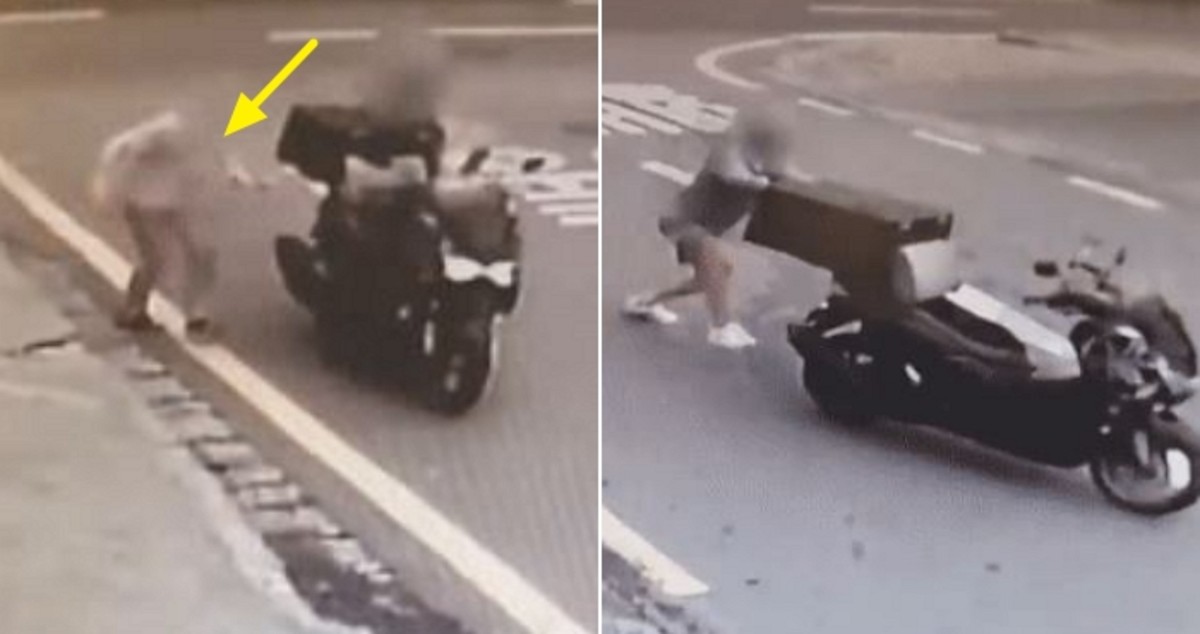 지난 26일 경기도 수원시 한 도로에서 찍힌 영상에는 한 배달 기사가 오토바이 짐칸에 물건을 집어넣는 사이 한 할아버지가 다가와 운전대를 잡고 액셀을 당기는 모습이 담겼다.