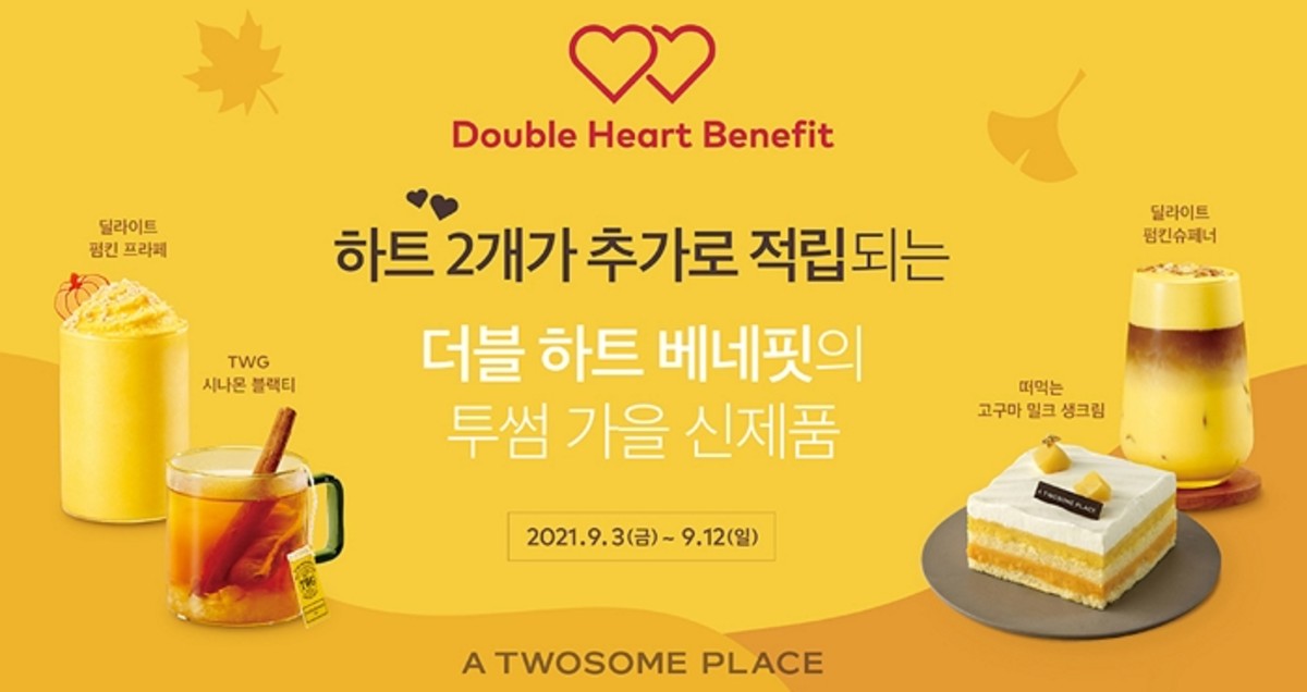 가을 신제품 구매 시 투썸 하트 2개를 추가로 증정하는 더블 하트 베네핏 이벤트도 진행한다. 행사 대상 제품은 투썸이 가을을 맞아 선보인 떠먹는 고구마 밀크 생크림, 딜라이트 펌킨슈페너, 딜라이트 펌킨 프라페와 TWG 시나몬 블랙티다. 이벤트에 대한 상세한 내용은 투썸플레이스 모바일 앱 '투썸하트' 이벤트 페이지에서 확인할 수 있다.