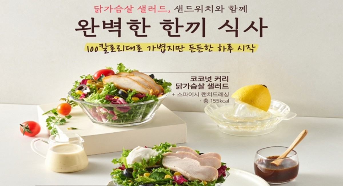 신제품 샐러드는 '코코넛 커리 닭가슴살 샐러드'와 '리코타치즈 닭가슴살 샐러드' 2종으로 칼로리는 각 135kal, 155kal이다.