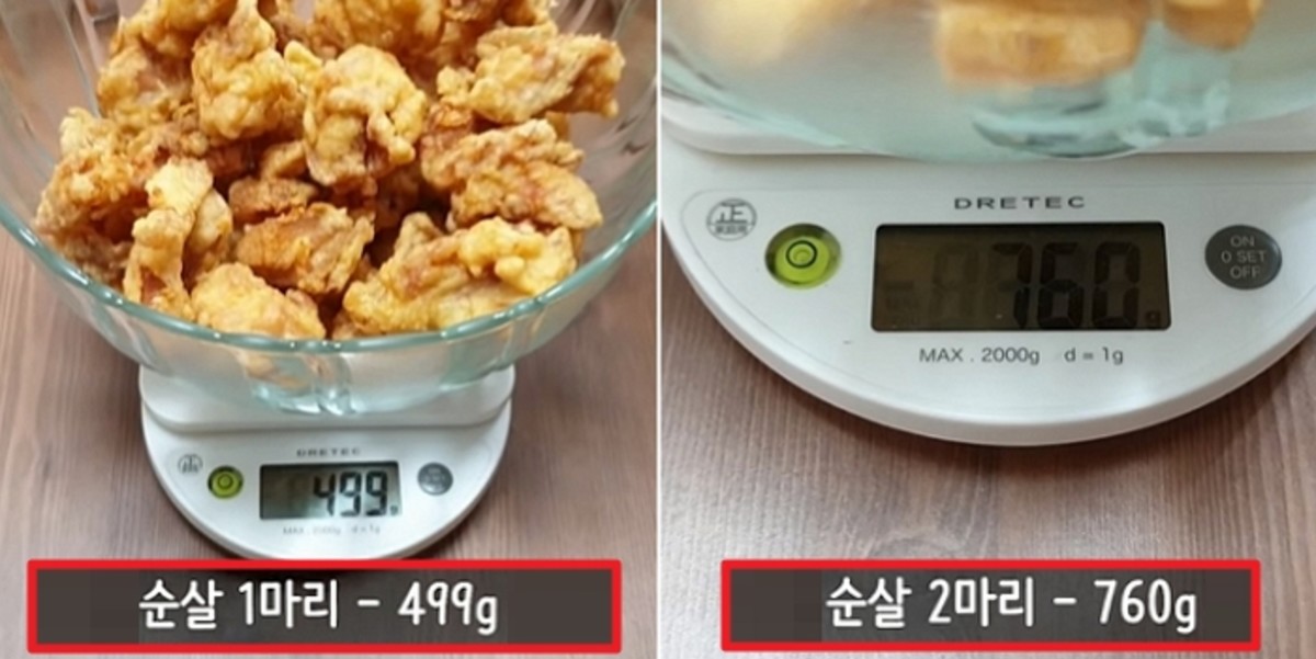 그는 순살 후라이드의 양 차이에 대해 비교한 결과 "처갓집 순살 1마리는 499g이고 2마리는 760g이다"라고 전했다. 두 마리 세트의 양이 한 마리 메뉴의 1.5배에 해당하는 양이었다.