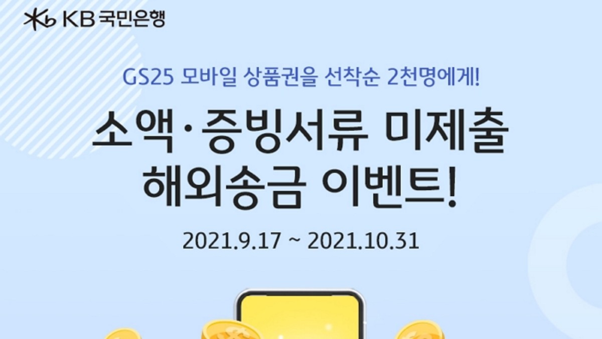 이번 이벤트는 인터넷뱅킹, KB스타뱅킹, 리브 앱을 통해 '소액송금' 또는 '지급증빙서류 미제출 해외송금'을 선택해 미화 100불 이상을 환전해 해외송금하는 고객을 대상으로 진행된다. 이벤트에 참여한 고객 선착순 2천 명에게 GS25 모바일 쿠폰을 증정한다.