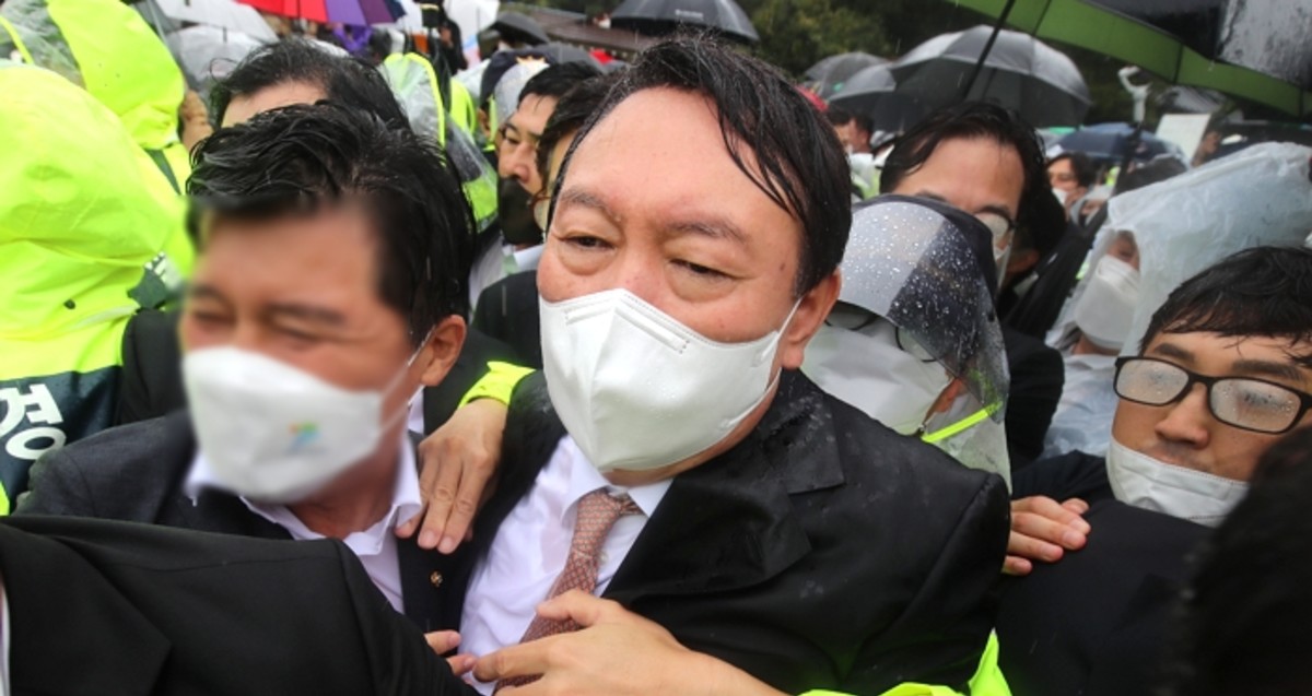 현장을 벗어나는 과정에서 윤 전 총장은 시위자들의 항의에 직면해 우산을 쓰지 못했다.