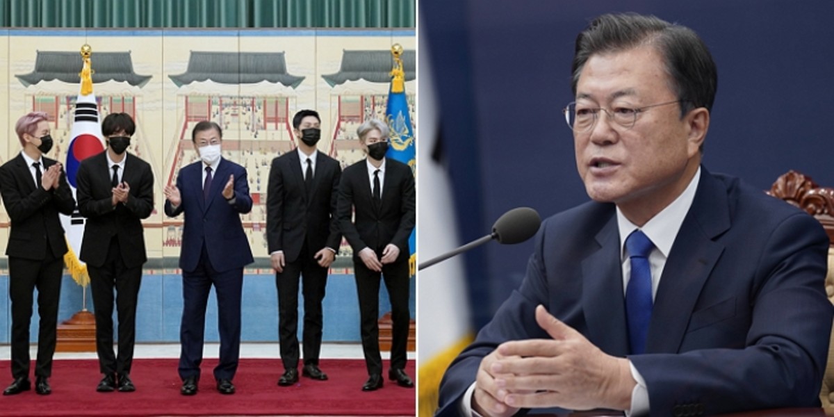 지난 14일 청와대에서 열린 미래세대와 문화를 위한 대통령 특별사절 임명장 수여식에서 BTS에게 임명장을 수여하고 기념촬영 중인 문재인 대통령 / 뉴스1