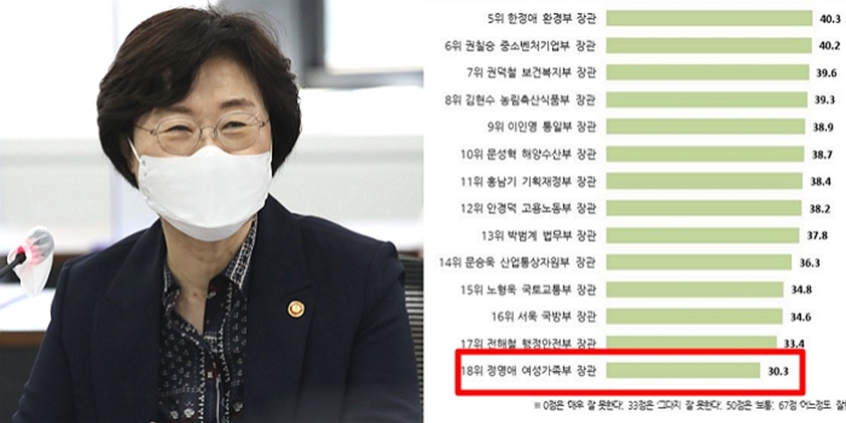 조사 결과 정영애 여성가족부 장관은 평균 30.3점을 받아 18개 부처 행정부 장관 중 18위를 차지했다.