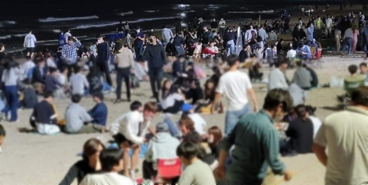 사진 속에는 충남 보령에 위치한 대천해수욕장으로 추정되는 해수욕장 모래사장에 젊은 사람들이 빼곡히 있다.
