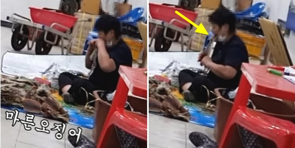 바닥에 쌓아둔 오징어를 '입'으로 물어뜯으며 손질하는 직원의 행동은 보는 이들에게 충격을 안겼다.