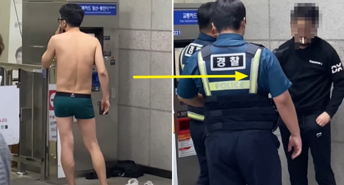 영상 속에 등장하는 남성 A씨는 역사 안에서 상의와 하의를 모두 벗은 채 불을 붙이지 않은 담배를 입에 물고 있었다.