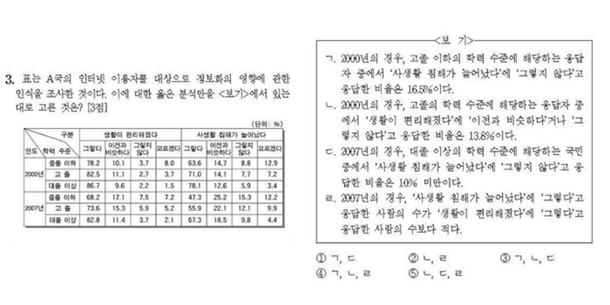 배점 3점인 해당 문항은 한 국가의 인터넷 이용자를 대상으로 정보화 영향에 관한 인식을 조사한 결과표를 제시하고 옳은 분석만을 '보기'에서 있는 대로 고르라는 문제였다.