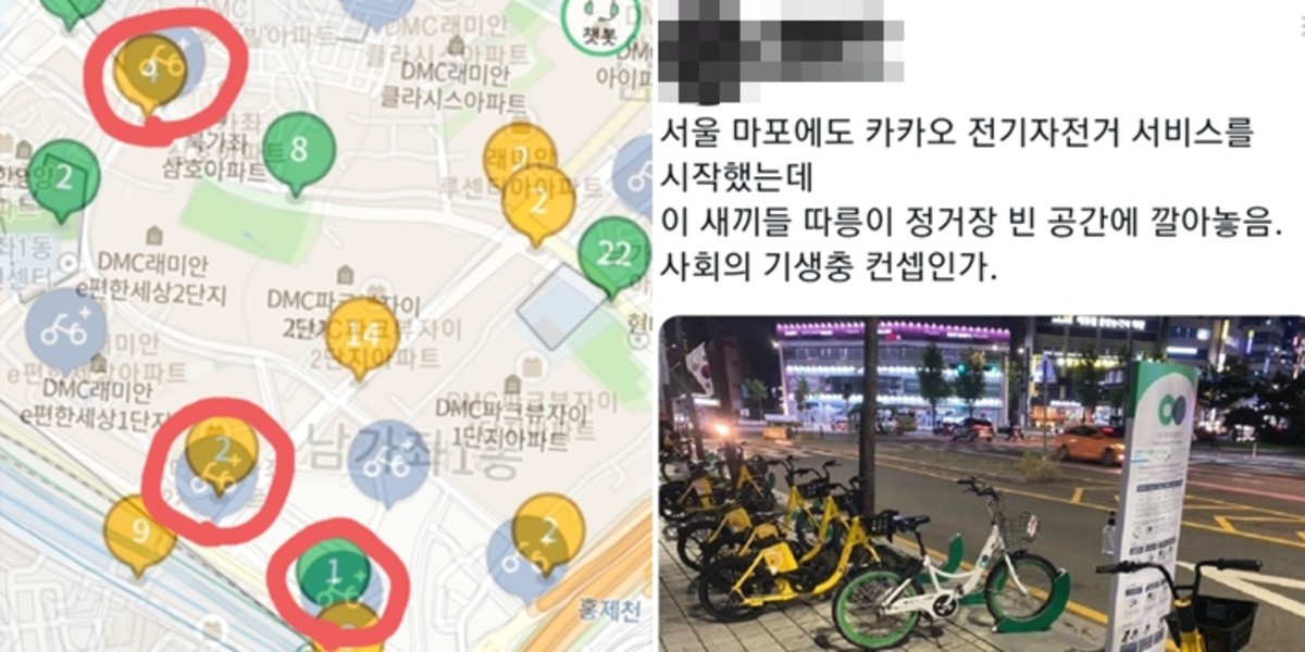 또 다른 누리꾼 역시 "서울 마포에도 카카오 전기자전거 서비스를 시작했는데 따릉이 정거장 빈 공간에 깔아놓음. 사회의 기생충 콘셉트인가"라며 비판했다.