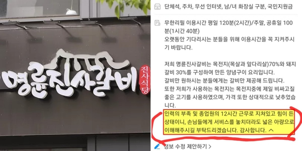 "인력 부족 및 종업원의 12시간 근무로 지쳐있고 힘이 든 상태니 손님들에게 서비스를 놓치더라도 넓은 아량으로 이해해 주세요"