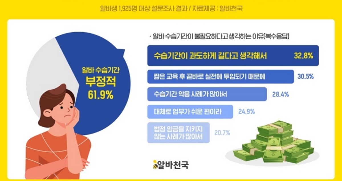 알바천국이 과거 아르바이트 경험이 있거나 현재 근무 중인 알바생 1,925명을 대상으로 '알바 수습기간' 관련한 설문조사를 진행한 결과, 5명 중 3명(61.9%)이 아르바이트 수습기간을 부정적으로 바라보며 불필요하다는 의견을 내비쳤다고 밝혔다.