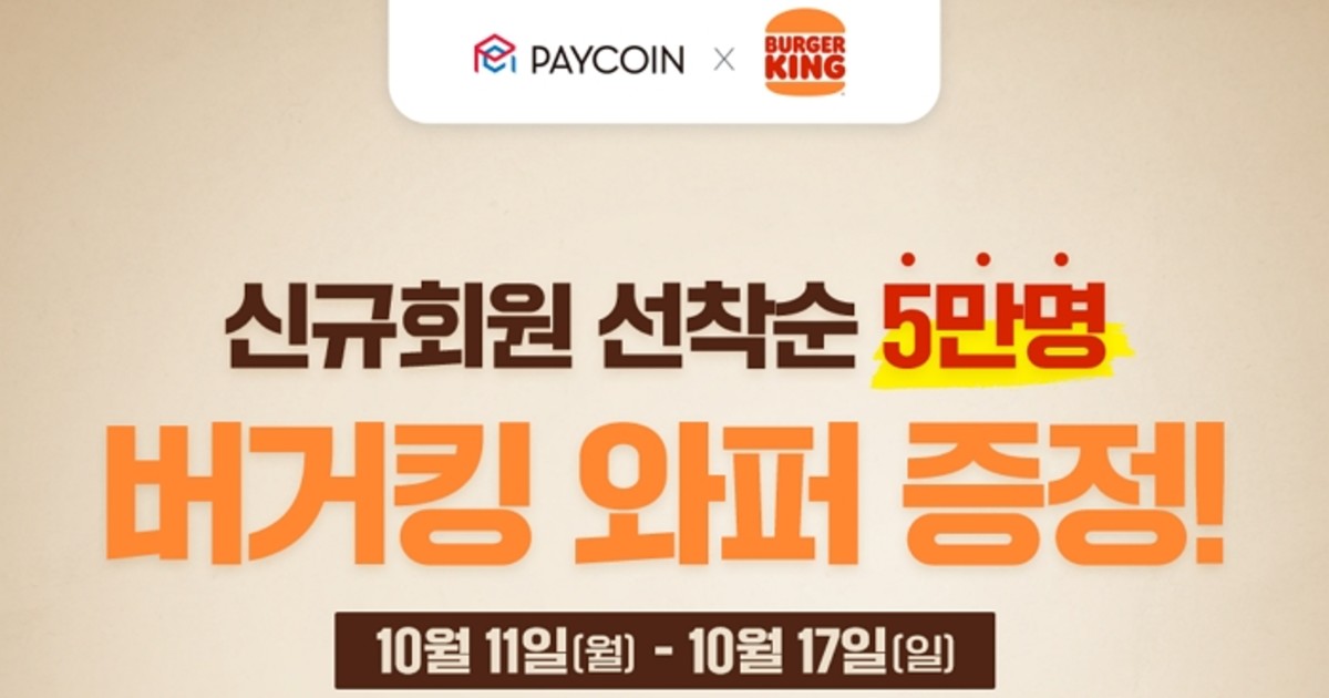 먼저 11일부터 17일까지 '페이코인X버거킹 와퍼 증정 이벤트'를 진행한다. 페이코인 신규 가입자를 위한 프로모션으로 회원 가입 시 리워드 코드 'BURGERKING'을 입력하면 '와퍼 제품 교환권'을 받을 수 있다.