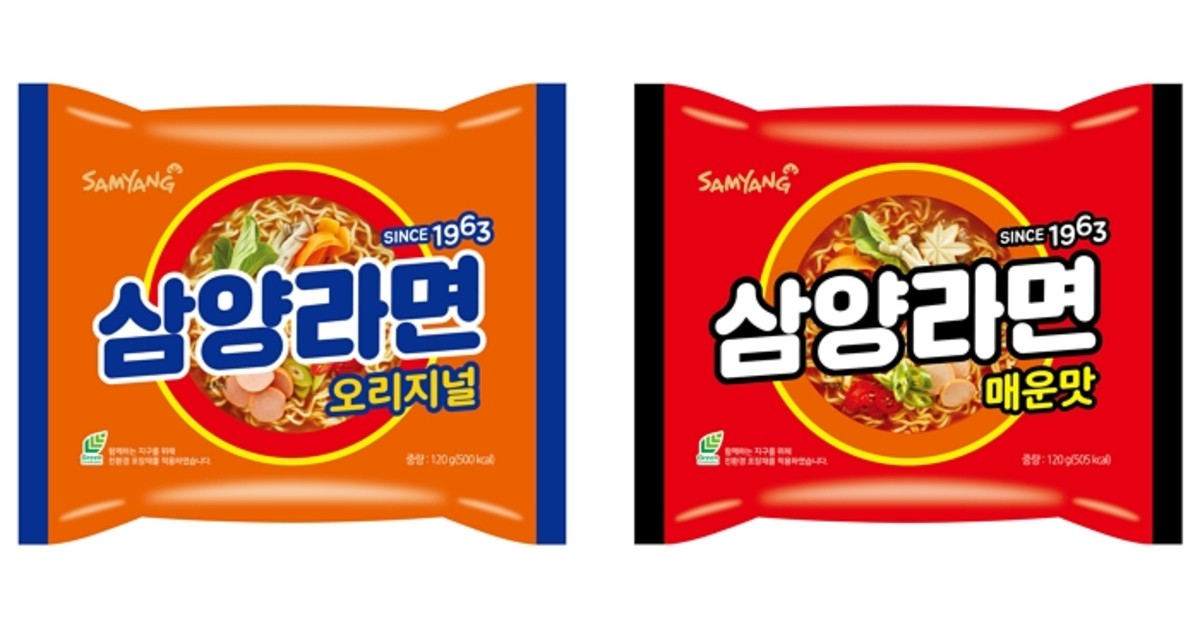 기존의 삼양라면 디자인 아이덴티티를 유지하며 오리지널 제품은 주황과 파랑, 매운맛 제품은 빨강과 검정의 강렬한 색상 대비로 주목도를 높인 것이 특징이다.