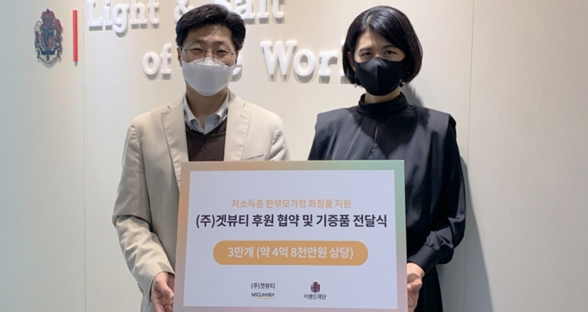 겟뷰티는 자연주의 천연화장품을 생산하고 미구하라, 리얼스킨, 구떼 3개 브랜드를 운영한다. 이번 협약을 계기로 판매가 기준 약 4억 8천만원 상당, 3만점 규모의 후원 물품을 이랜드재단에 기증하고, 이랜드재단은 이를 다양한 여성 물품과 매칭해 저소득층 여성 가정에게 전달할 예정이다.