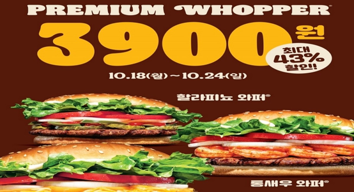 프로모션 대상 메뉴는 '통새우와퍼', '콰트로치즈와퍼' 및 '할라피뇨와퍼'로 메뉴에 따라 최대 43% 할인 혜택을 누릴 수 있다.