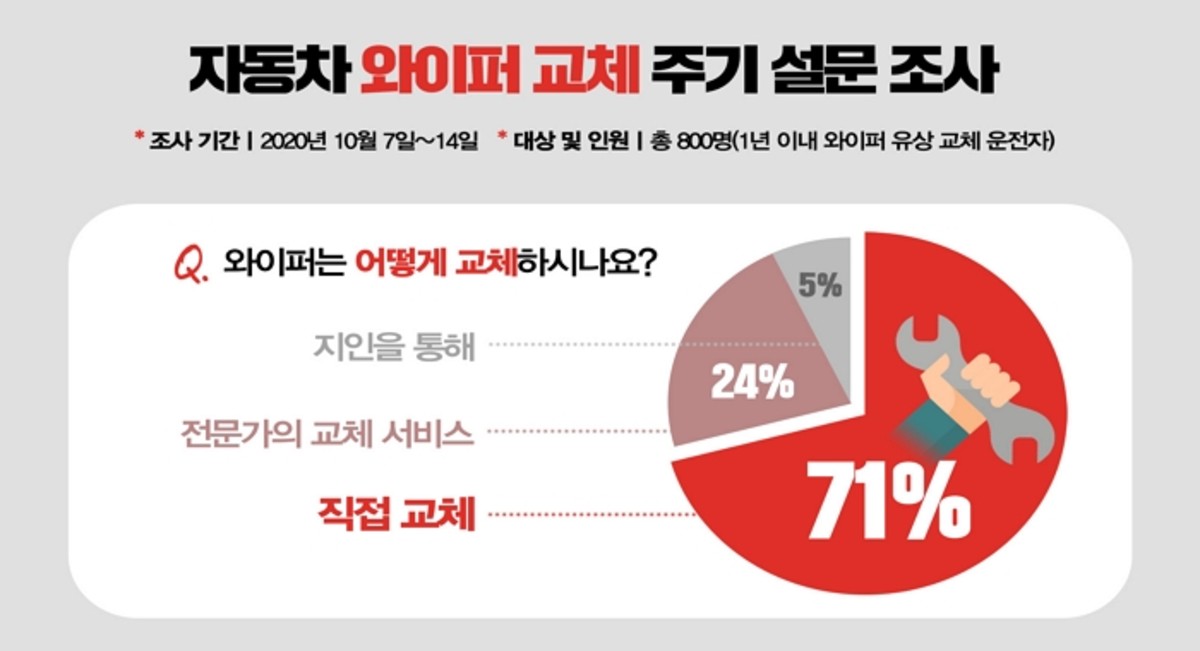 불스원이 지난해 리서치 전문 기업 엠브레인과 함께 남녀 운전자 800명을 대상으로 '자동차 와이퍼 교체주기' 관련 설문 조사를 진행한 결과, 와이퍼를 스스로 교체하는 고관여 운전자는 71%를 차지할 정도로 높았지만, 와이퍼를 주기적으로 교체한다고 응답한 운전자는 54% 로 절반에 그쳤다. 5년 전인 지난 2015년과 비교해봐도 48%에서 약 6% 증가한 수준이다.