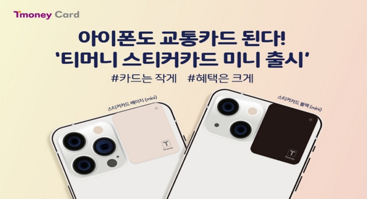 '티머니 스티커카드 미니'는 밝은 색상의 아이폰에 적합한 '베이지'와 어두운 색상의 아이폰에 어울리는 '블랙' 2종으로 심플하다. 세로 길이를 기존보다 1Cm정도 축소해 아이폰에 붙였을 때 잘 어울리게 디자인했다. 또한, 작아진 사이즈로 맥세이프 카드지갑 등 아이폰 악세서리와도 함께 사용이 가능하다.