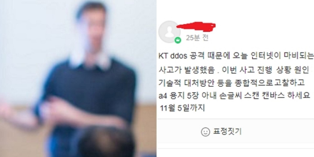 공지에는 "KT 디도스(DDos) 공격 때문에 오늘 인터넷이 마비되는 사고가 발생했음"이라며 "이번 사고 진행 상황 원인 기술적 대처방안 등을 종합적으로 고찰하고 A4용지 5장 이내 손글씨 스캔 캔바스 하세요"라는 내용이 적혔다.