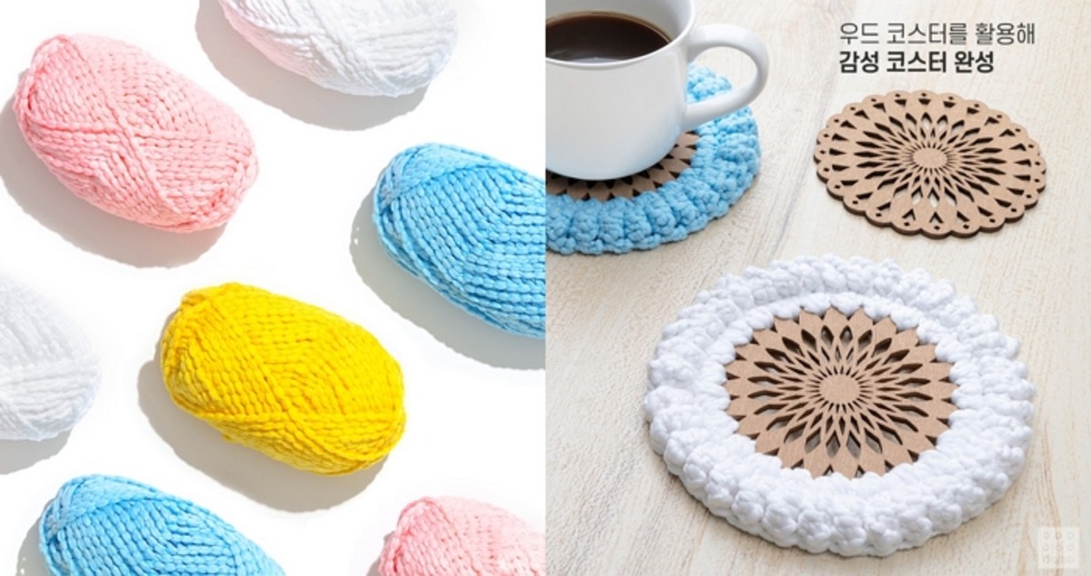 '극세사 행주 뜨개실'은 흡수력과 탈수력이 좋아 행주, 코스터, 헤어핀 등을 만들기 좋다. '목제 코스터'에 뜨개실을 가장자리에 엮으면 겨울철에 어울리는 감성 코스터를 만들 수 있다.