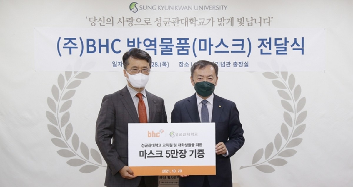 [인사이트] 조세진 기자 = bhc치킨은 지난 28일 오후 성균관대학교 인문사회과학캠퍼스 600주년 기념관에서 대학교에 마스크 5만 장을 기증하는 전달식을 개최했다고 밝혔다.
