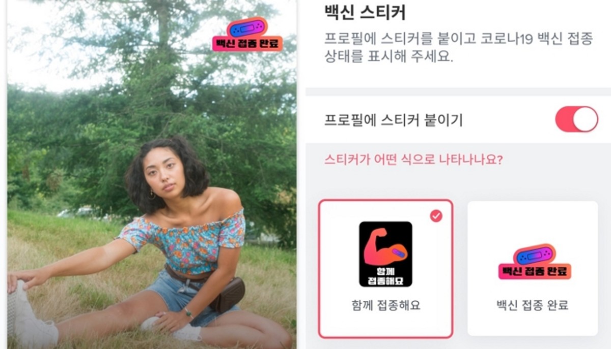 국내 틴더 회원들은 모바일 애플리케이션 메인 화면을 통해 접속 가능한 '백신 센터'를 통해 개인 프로필에 다양한 문구와 디자인의 스티커로 백신 접종 여부를 표시할 수 있다.