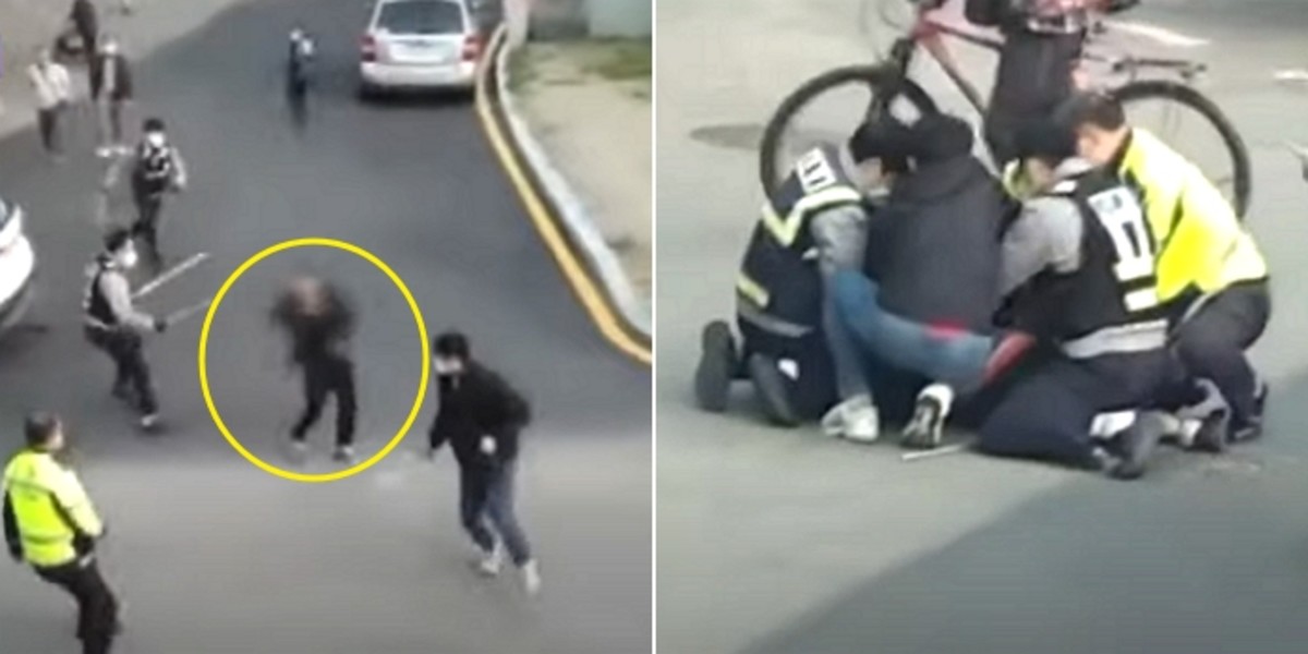 영상에 따르면 중국 국적 남성 A씨는 양쪽 손에 흉기를 둔 채 마구 휘둘렀다.