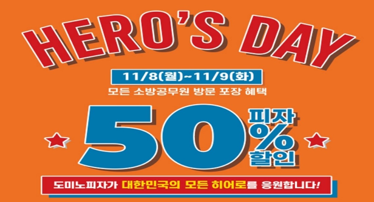[인사이트] 조세진 기자 = 도미노피자는 다가오는 소방의 날(11월 9일)을 맞아 대한민국 모든 소방 공무원을 대상으로 '히어로즈 데이'를 실시한다고 밝혔다.