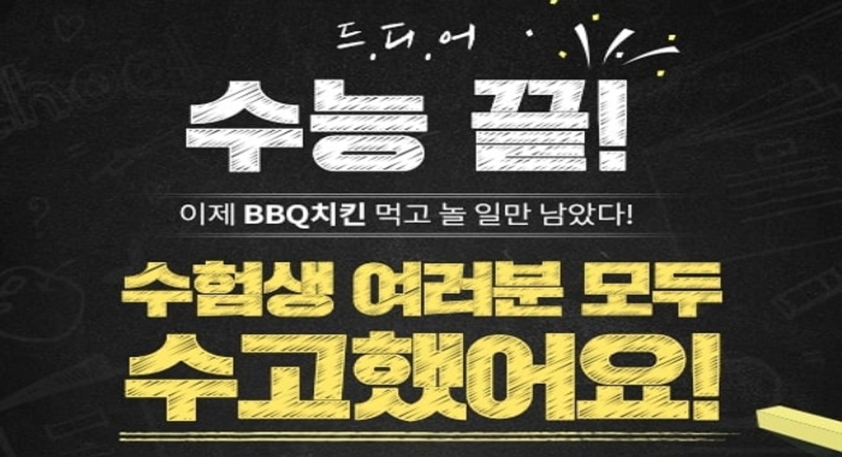 BBQ 관계자는 "시험 준비로 고생한 수험생들을 위해 특별한 이벤트를 준비했다" 며 "BBQ 치킨과 함께 그동안 쌓였던 스트레스를 푸는 기회가 되기를 바란다"고 말했다