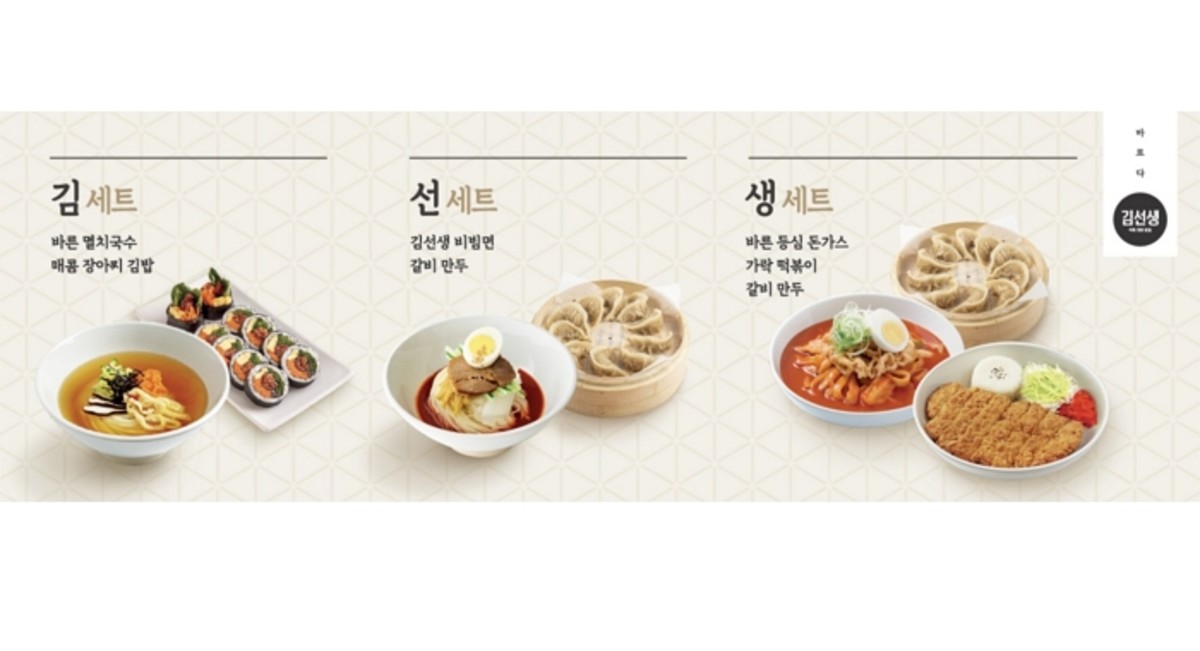 이번 세트 메뉴들은 그동안 바르다 김선생에서 가장 인기있었던 메뉴들로 구성, '김'세트는 '바른 멸치국수'와 '매콤 장아찌 김밥' 조합으로 시원한 국물과 살짝 매콤한 김밥의 조화가 일품이다.