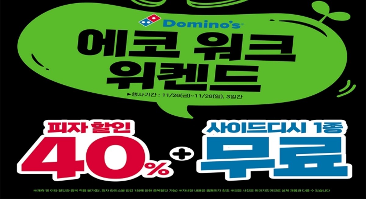 [인사이트] 조세진 기자 = '에코 워크 위켄드'는 도미노피자의 친환경 캠페인의 일환으로 11월 26일부터 28일까지 3일간, 방문 포장 주문을 하는 모든 고객에게 피자 포장 40% 할인 혜택과 모든 사이드디시 중 1종 무료 혜택을 제공한다고 밝혔다.