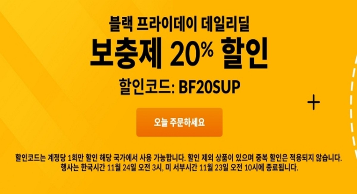 이번 행사에서는 아이허브 베스트셀러인 영양제를 비롯해 다양한 품목들에 20% 할인률이 적용된다. 기존 3일간 진행하던 블랙 프라이데이 세일과 비교해 역대 최대 규모로 미국과 한국에서 동시 진행된다.