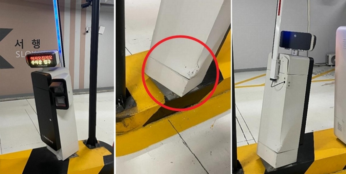 공개된 사진에는 주차관리를 위한 차량 출입 차단기가 설치된 한 지하 주차장의 모습이 담겼는데, 고정된 부위가 망가진 듯 한쪽으로 기울어 있었다.