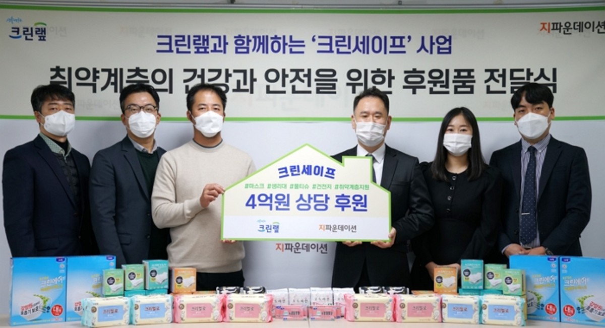 크린랲은 미세먼지 마스크 16만 장과 물티슈, 하이퍼맥스 건전지, 생리대 등 현물과 크린세이프 키트 제작 현금 등 총 4억원 상당의 현물과 현금을 국내외 취약계층 아동과 청소년들을 위해 기부하기로 하고, 지난 23일 서울 마포구 소재 지파운데이션 사옥에서 기부물품 전달식을 가졌다고 밝혔다.
