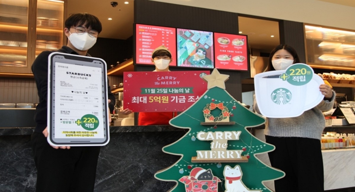 [인사이트] 김소영 기자 = 스타벅스커피 코리아가 다가오는 연말 크리스마스 시즌을 맞아 오는 11월 25일 목요일 하루 동안 고객이 구매한 품목 및 적립된 별에 따라 최대 5억원의 기금을 조성해 우리 지역사회에 전달하는 '캐리 더 메리 나눔의 날'을 전개한다고 밝혔다.