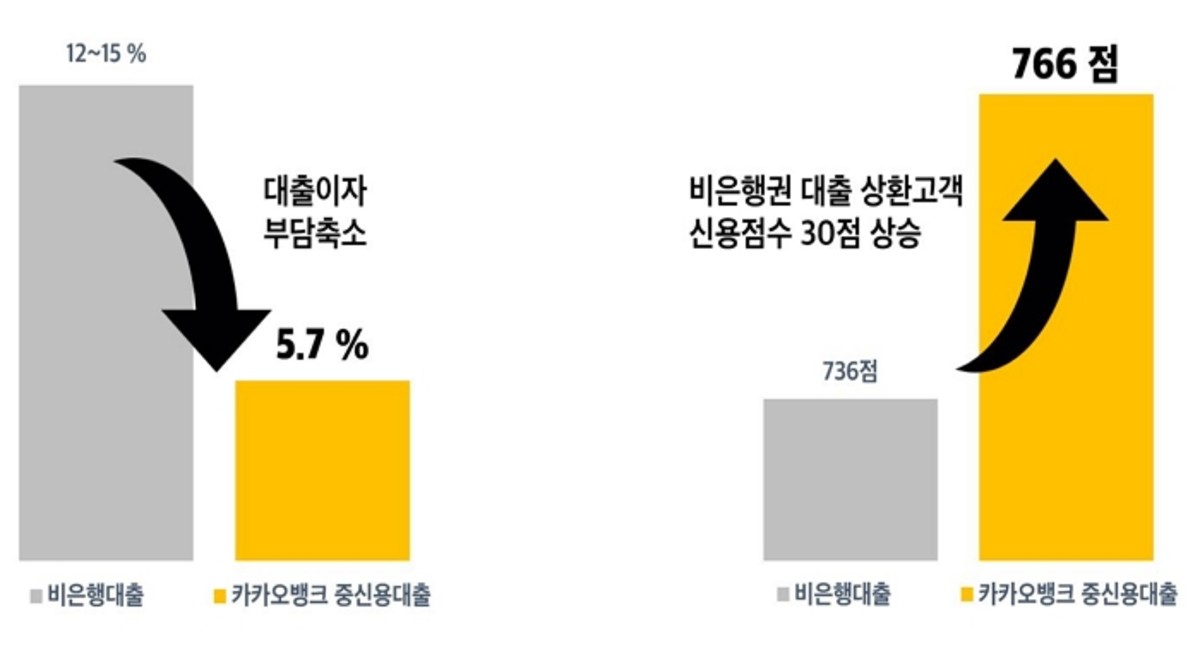 실제 카카오뱅크에서 중신용대출 고객을 받기 전 비은행권 대출이 있던 고객 10명중 6명은 대출금 전부 또는 일부를 고금리 대출을 상환하는데 사용했으며, 이로 인해 평균 7~30점 가량 신용점수가 상승한 것으로 나타났다.