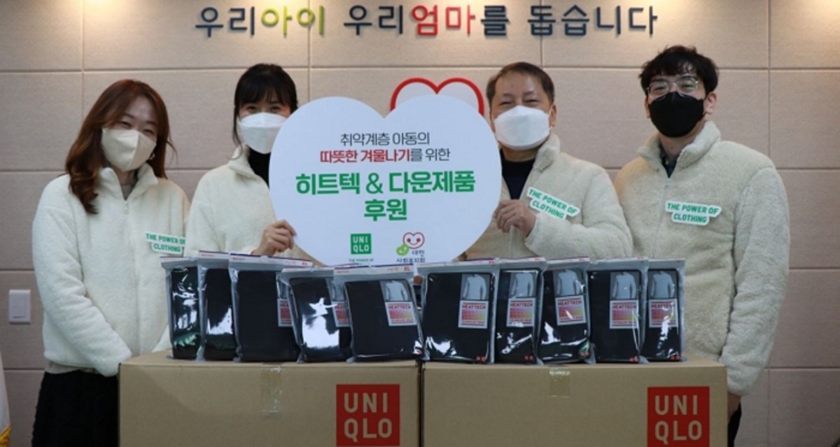 유니클로는 12월 13일 아동복지전문 사회복지법인인 대한사회복지회를 통해 복지 시설에서 생활하고 있는 어린이들에게 약 2천만 원 상당의 히트텍 및 다운 제품 800벌을 기부했다고 말했다.