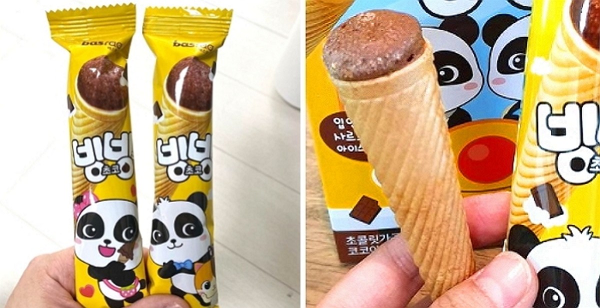 '빙빙 초코'는 초콜릿이 들어간 아이스콘 과자로 콘 모양을 하고 있다.