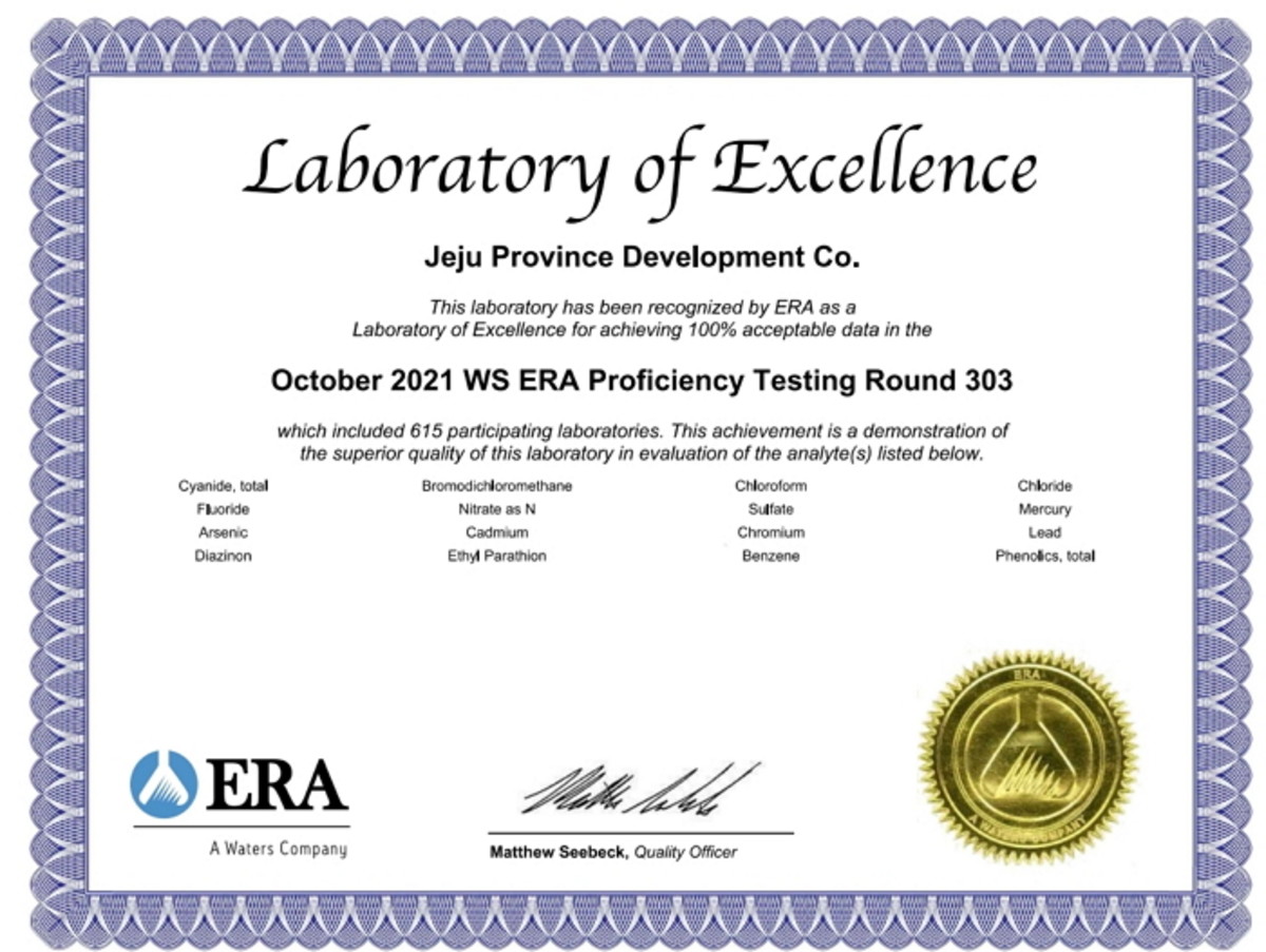 제주삼다수를 생산, 판매하는 제주특별자치도개발공사는 미국 환경자원협회(ERA)와 시그마-알드리치(SIGMA-ALDRICH)에서 실시한 먹는물 분야 국제숙련도 평가에서 최우수등급(Excellence)을 받으며 우수 분석기관 인증을 획득했다고 28일 밝혔다.