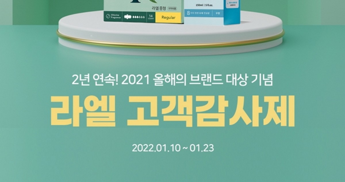 라엘은 올해의 순면생리대, 여성청결제 부문에서 2년 연속 대상의 영예를 안았다. 이를 기념하기 위해 오는 23일까지 라엘 자사몰에서 고객 감사제를 진행한다.
