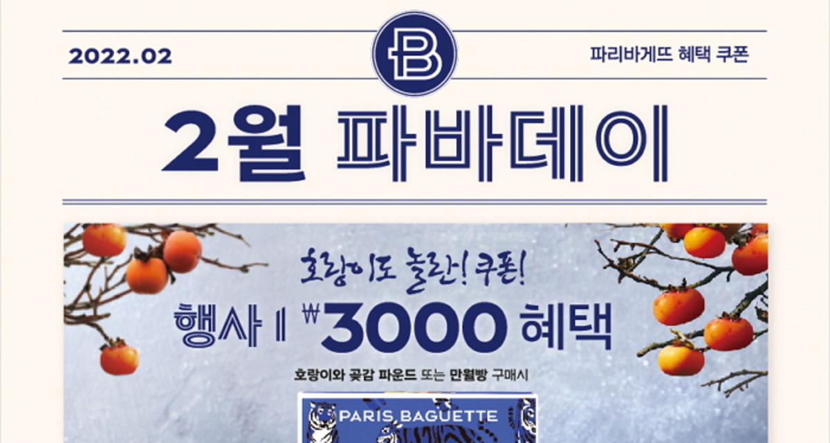 호랑이의 건강한 기운을 담은 설 선물 제품 혜택도 선보인다. 28일부터 2월 5일까지 부드러운 파운드 케이크에 달콤한 곶감과 건강한 견과류가 콕콕 박힌 '호랑이와 곶감 파운드' 또는 보름달을 닮아 건강과 복을 기원하는 마음을 담은 '만월빵' 구매 시 3천원의 혜택을 받을 수 있는 쿠폰을 제공한다.