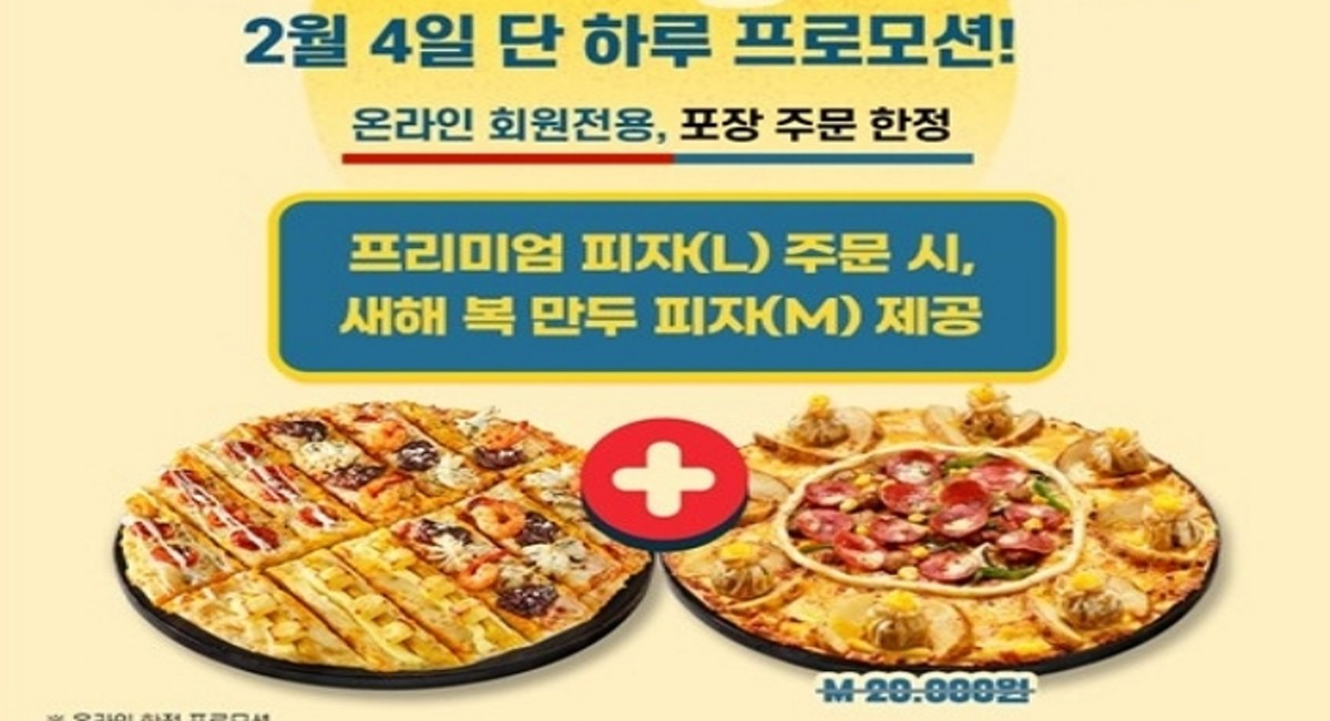 [인사이트] 조세진 기자 = 도미노피자는 오는 4일 하루 동안 온라인 회원들을 대상으로 프리미엄 피자 L 사이즈를 온라인 방문 포장하면 새해 복 만두 피자 M사이즈 1판을 무료로 제공한다고 밝혔다. 사이드디시 반값 혜택과 함께 사용할 수 있다.