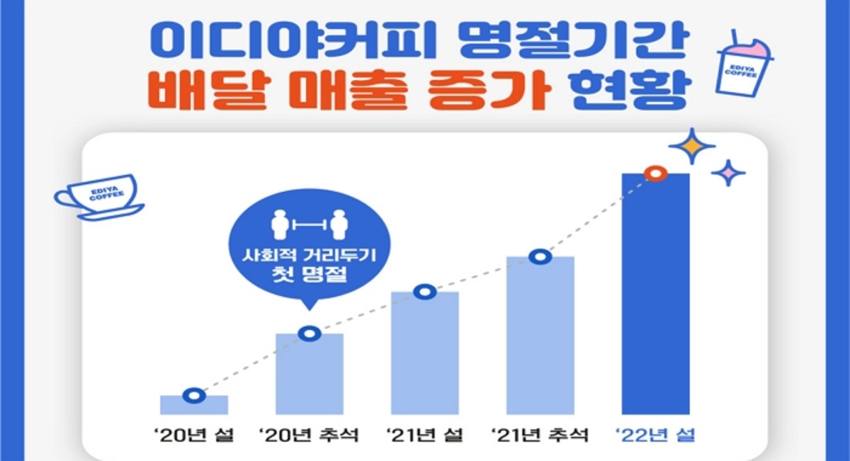 한편, 코로나19 이후 이디야커피의 명절 기간 배달 매출은 지속 증가 추세를 보이고 있다. 지난 추석 연휴기간, 이디야커피의 배달 매출은 전주 대비 약 60% 증가했다. 또한 비대면 명절이 시작된 지난 2020년 추석 이후 이디야커피의 명절 기간 배달 매출은 지속 증가 추세를 보여 올해 설 당일 배달 매출은 지난 2020년 추석 당일보다 약 3배 증가했다.