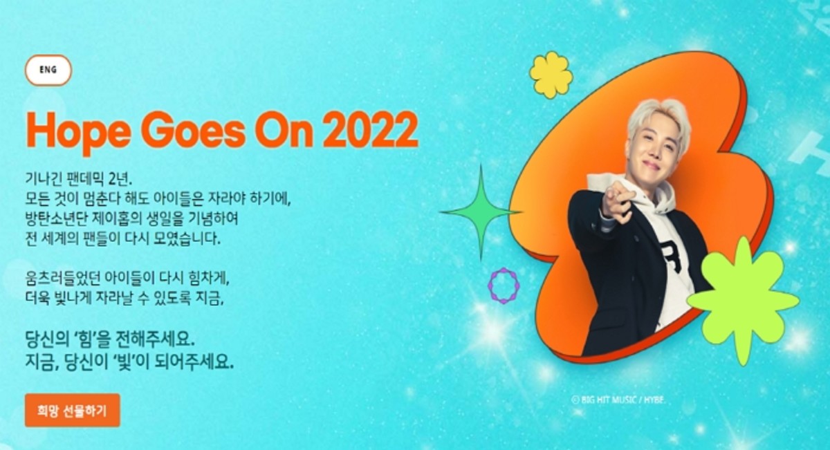 올해 '홉 고즈 온 20022' 캠페인은 제이홉의 생일(2월 18일)을 맞아 지난 2월 3일부터 오는 28일까지 한 달간 캠페인 페이지를 통해 진행 중이다. 현재까지 8개국 340여 명이 참여해 1,300만 원이 모금됐으며, 후원금은 국내 저소득가정 아동의 신학기 지원사업에 사용될 예정이다.