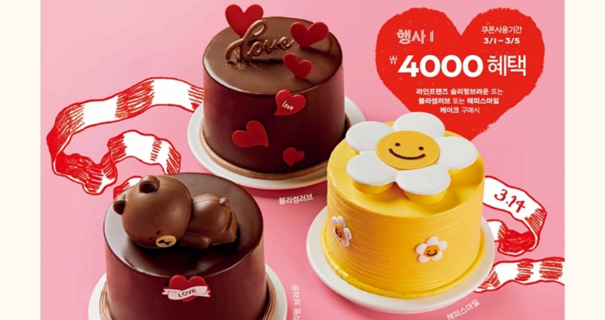 다가오는 화이트데이를 맞아, 달콤한 맛과 사랑스러운 비주얼의 케이크 3종 프로모션도 진행한다. 오는 3월 1일부터 5일까지 '라인프렌즈 슬리핑 브라운', '블라썸러브', '해피스마일' 케이크 구매 시 4천원 혜택 쿠폰을 제공한다.