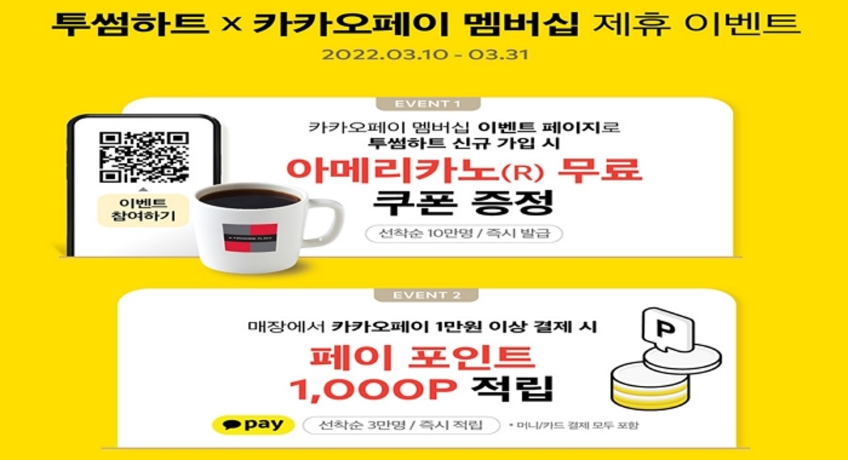 투썸플레이스는 이번 카카오페이 멤버십 제휴를 기념해 이벤트를 진행한다. 우선 카카오페이 멤버십 이벤트 페이지를 통해 투썸하트 멤버십을 신규 가입하는 선착순 10만명에게 아메리카노 무료 쿠폰을 증정한다. 쿠폰은 투썸하트 앱에 등록 후, 투썸오더로 주문 시 사용 가능하다.