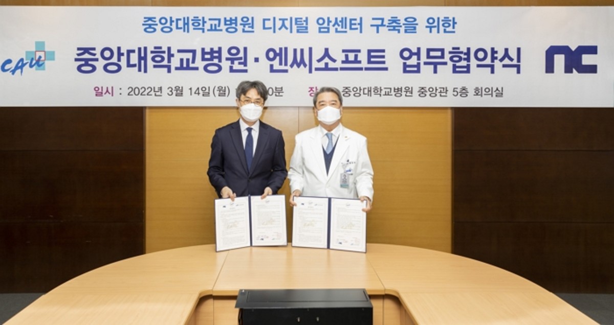 엔씨와 중앙대병원은 지난 14일 중앙대병원에서 '디지털 암 관리센터 구축 업무협약식'을 진행했다. 협약식에는 엔씨 커뮤니케이션센터 안용균 전무, 중앙대의료원 홍창권 의료원장, 중앙대병원 이한준 병원장 등이 참석했다.